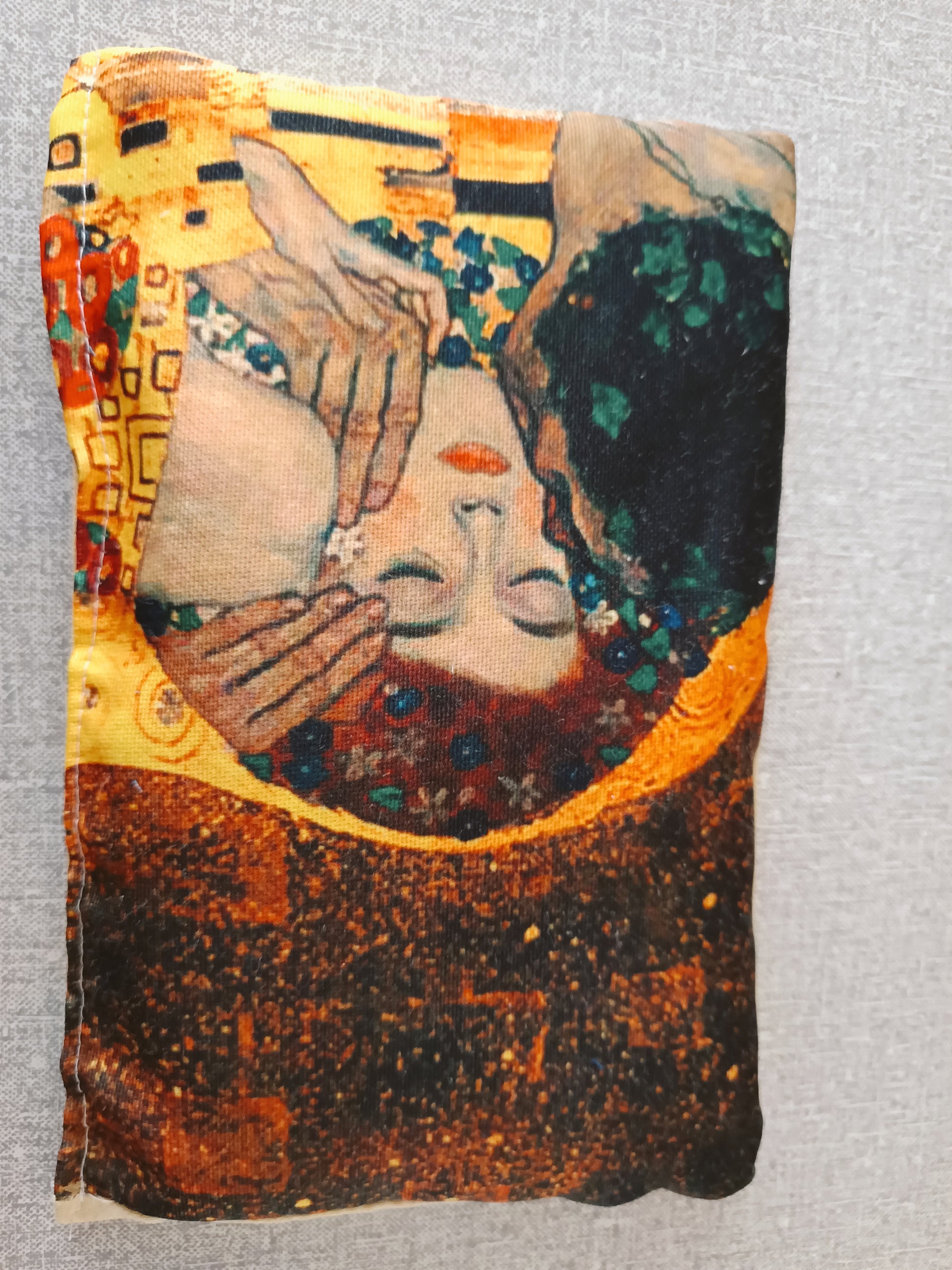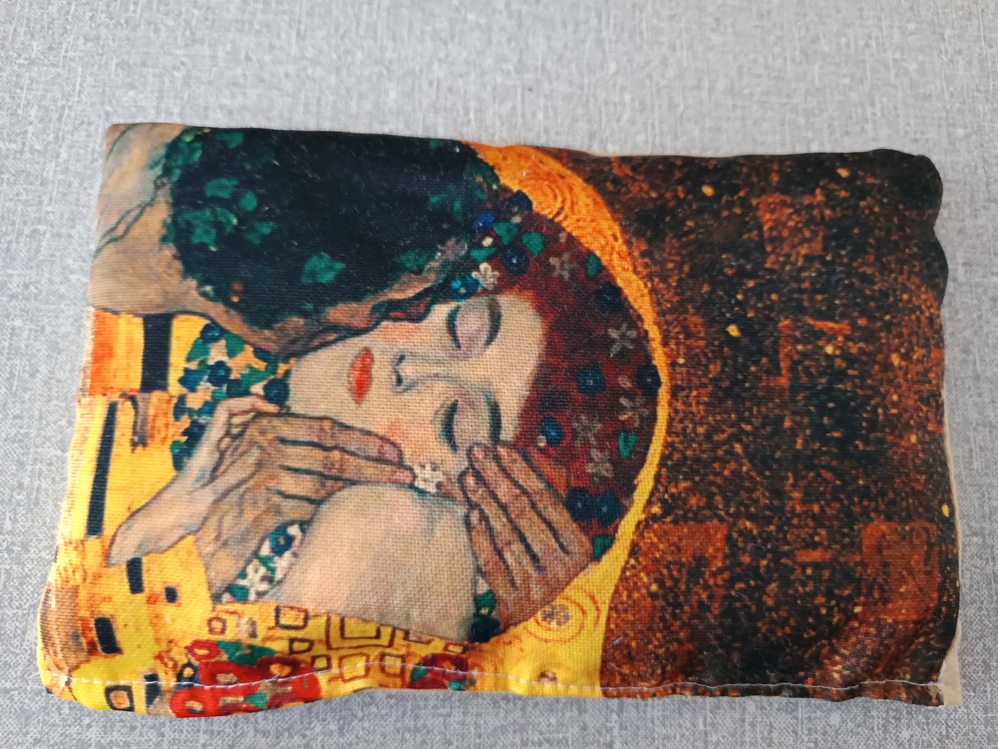 Μια μοναδική, χειροποίητη θερμοφόρα με υφασμάτινο κάλυμμα εμπνευσμένο από τον πίνακα "Το Φιλί" του Gustav Klimt. Ιδανική για ζεστά ή κρύα επιθέματα και για φυσική ανακούφιση από πόνους και στρες.