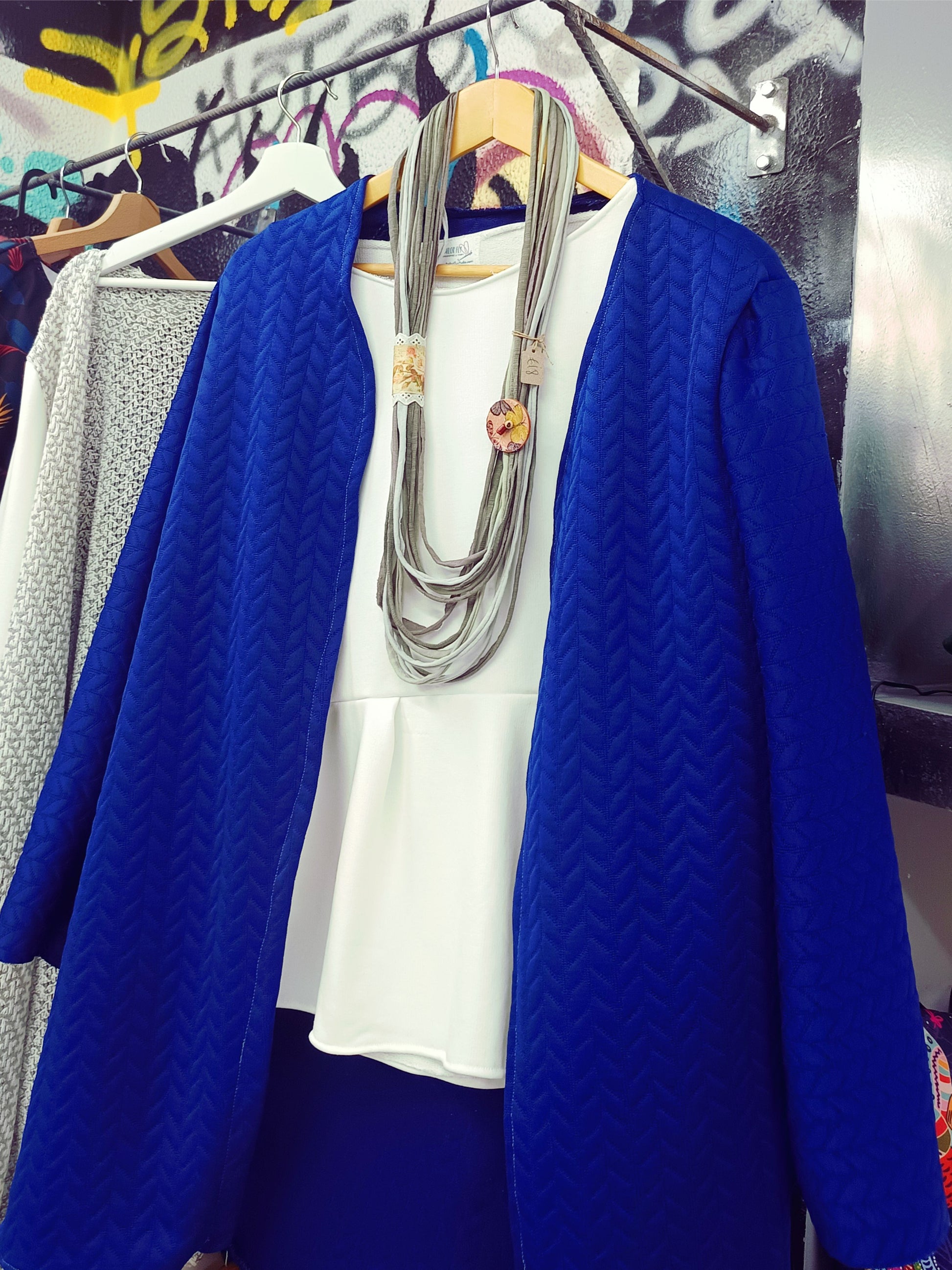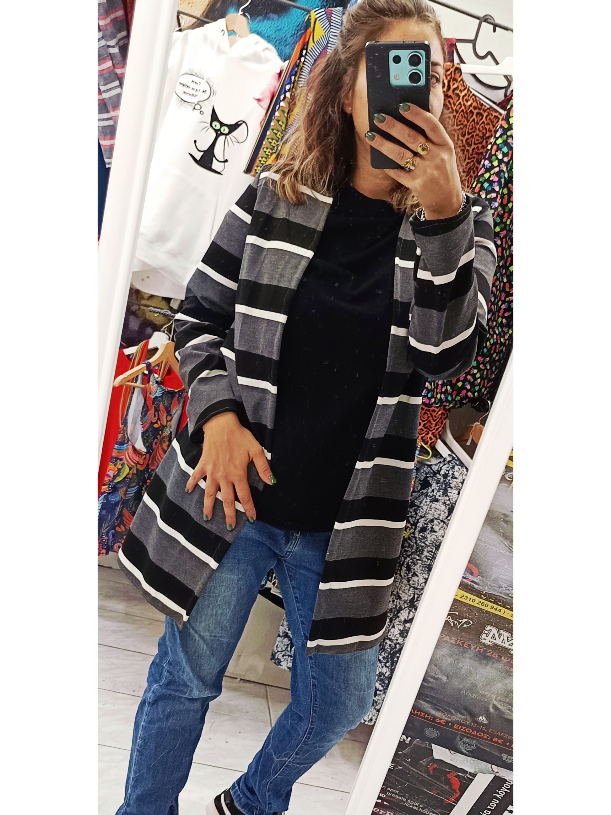 Ριγέ ζακέτα σε κομψούς τόνους γκρι, μαύρου και άσπρου, που φτάνει λίγο πιο πάνω από το γόνατο για έναν μοντέρνο και άνετο στυλ. Το ανοιχτό V στο κλείσιμο προσφέρει μία κομψή και ελαφρώς casual αίσθηση, κάνοντάς την ιδανική για layering σε καθημερινές εμφανίσεις. Το μαλακό ύφασμα και η άνετη γραμμή της εξασφαλίζουν άψογη εφαρμογή και ελευθερία κινήσεων, κάνοντάς την μια ευχάριστη επιλογή για κάθε εποχή.